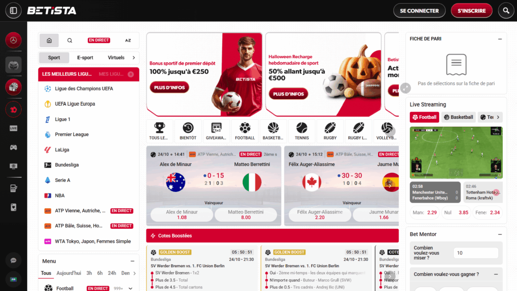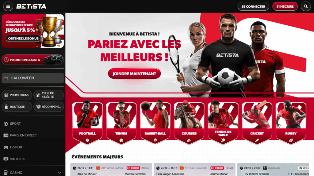 Quoi qu’il en soit, visuellement, Betista est très agréable à voir comme à utiliser. Le site web adopte un design moderne et dynamique, dominé par des tons noirs, rouges et blancs, qui rappellent les codes du sport et du jeu.
