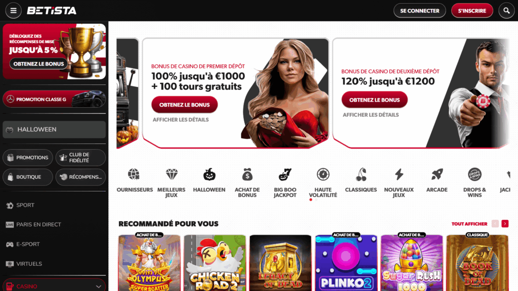 Le site web de Betista, toutes les sections essentielles, sports, casino, bonus, promotions et caisse, sont accessibles dès la page d’accueil, sans navigation complexe. L’interface est claire et bien structurée, avec un menu latéral fixe qui permet de passer facilement d’un univers à l’autre, que ce soit pour placer un pari, consulter ses bonus ou accéder au chat en direct.