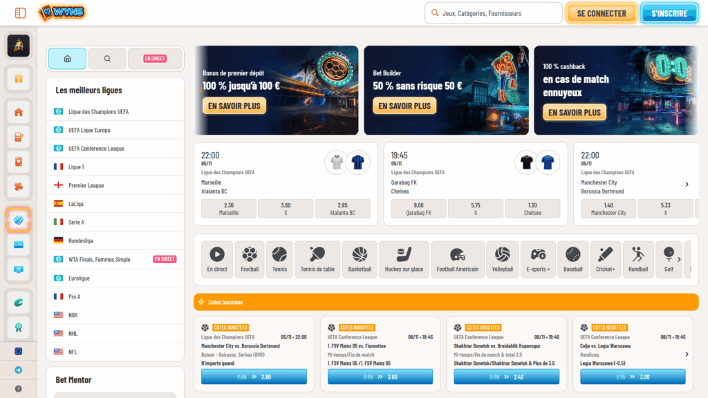 Sur Wyns, tout est pensé pour qu’on trouve rapidement ce qu’on cherche sans se perdre dans des sous-menus interminables. Dès l’arrivée sur le site web, le menu latéral regroupe l’essentiel incluant paris sportifs, casino, promotions, service client, etc.
